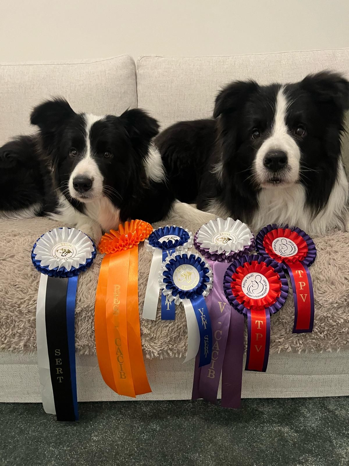 Olemme saaneet myös kaksi uutta valioarvoa, kun A-tiimiläisiä pyörähti autollinen Virossa. Komea veteraanipoikamme "Ukko" (C.I.E. FI MVA LT MVA EE MVA FI VMVA LT VMVA EE VMVA HeJW-16 JV-16 BALTV-17 V-21 BALTVV-24 Amazeme Imperial Strike) oli molempina päivinä ROP VET saaden veteraanisertin ja näin ollen Ukko valioitui Viron Veteraanimuotovalioksi. Lauantaina Ukko oli myös PU2 ja sunnuntaina PU3. Ukon tyttö, "Mimmi" (FI MVA LT MVA EE MVA FI JMVA Amazeme Zenith Diamonds) esiintyi edukseen ja oli molempina päivinä PN2. Lauantaina Mimmi sai sertin ja valioitui Viron Muotovalioksi. Mukana matkassa oli myös "Kiira" (FI MVA Amazeme Jade Shines The Brightest), joka sai molempina päivinä erinomaisen ja sijoittui luokassaan kolmanneksi. Paljon onnea oikein hienosti menneestä reissusta Säteelle ja Jaanalle!
